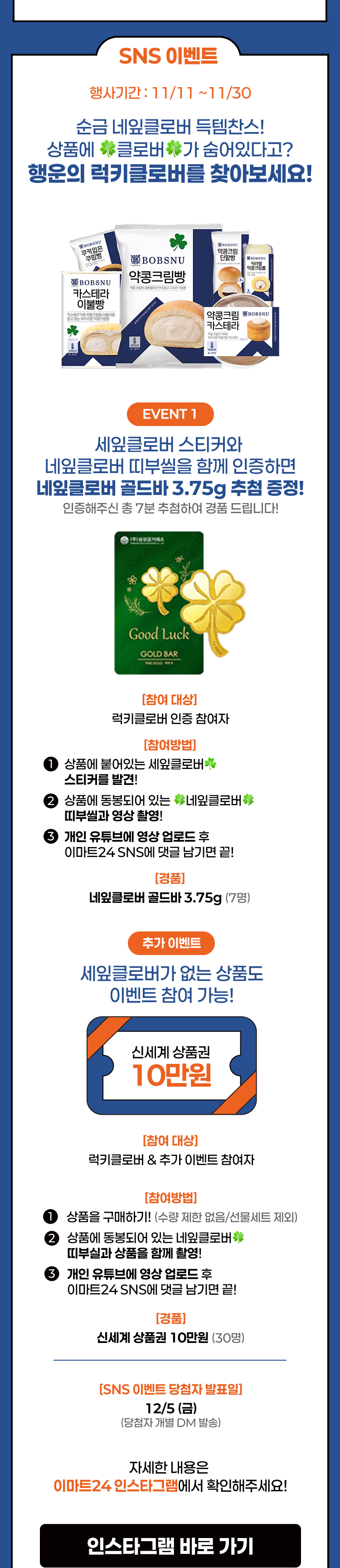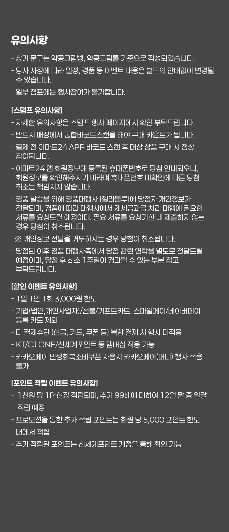 - 결제 전 이마트24 APP 바코드 스캔 후 대상 상품 구매 시 정상 참여됩니다.