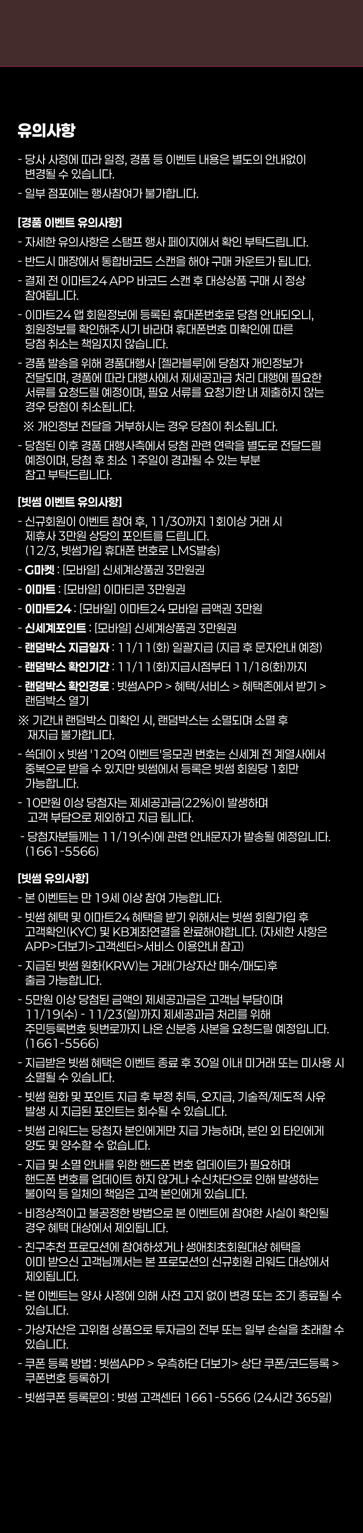 - 이마트24 앱 회원정보에 등록된 휴대폰번호로 당첨 안내되오니, 회원정보를 확인해주시기 바라며 휴대폰번호 미확인에 따른 당첨 취소는 책임지지 않습니다.