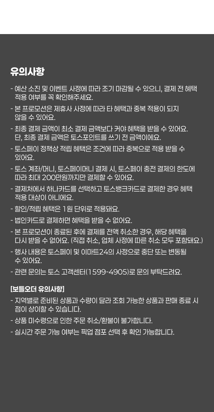 - 행사 내용은 토스페이 및 이마트24의 사정으로 중단 또는 변동될 수 있어요.
