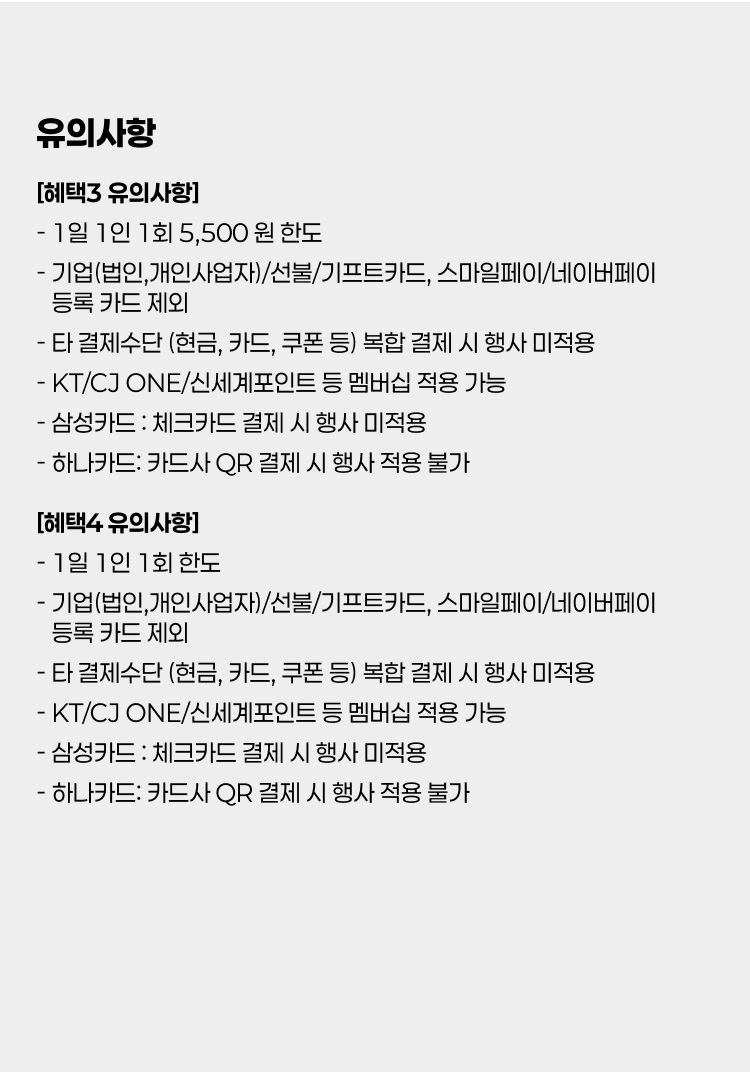 - 타 결제수단 (현금, 카드, 쿠폰 등) 복합 결제 시 행사 미적용