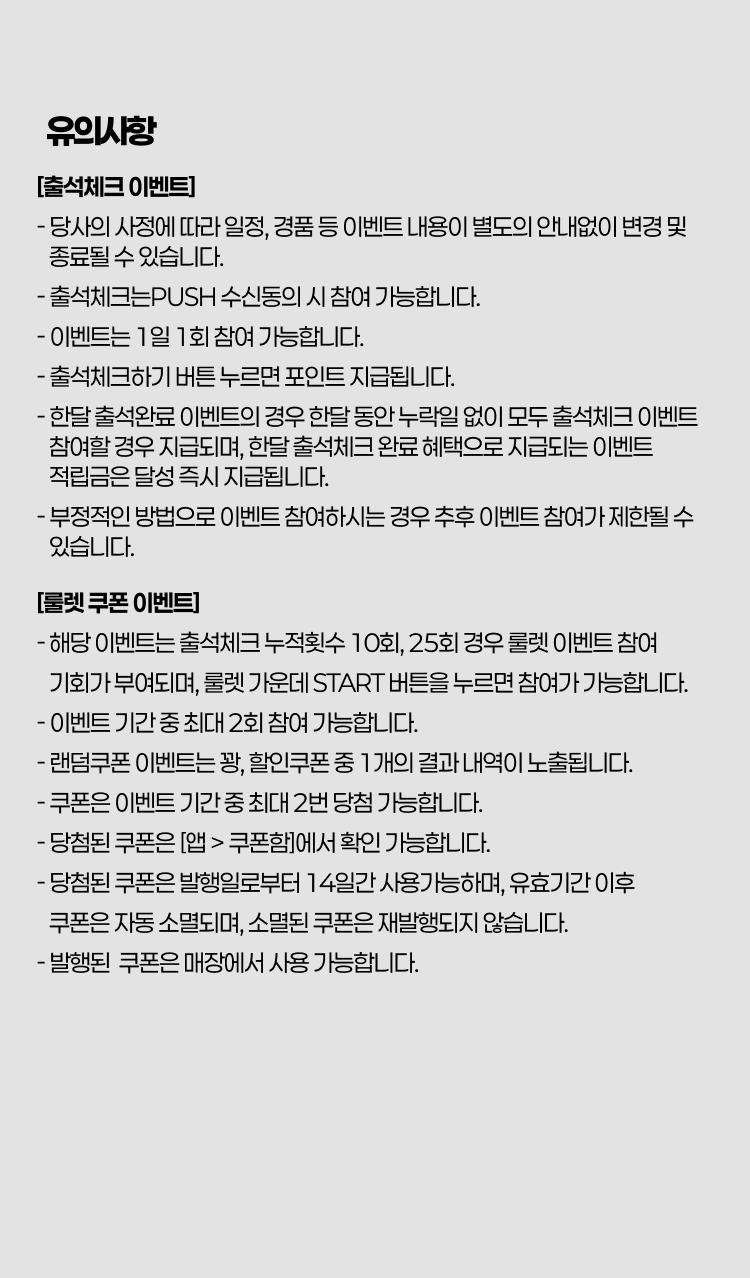 - 출석체크는PUSH 수신동의 시 참여 가능합니다.