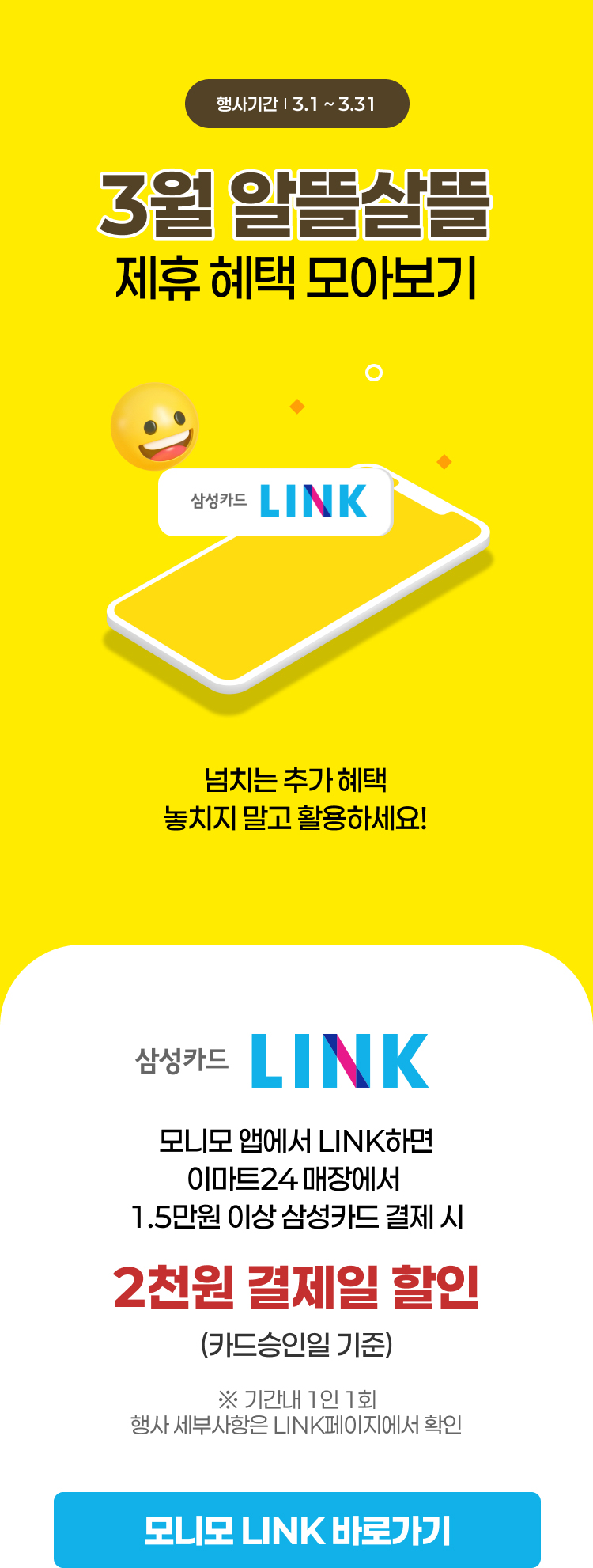 - 모니모 앱에서 LINK하면 이마트24 매장에서 1.5만원 이상 삼성카드 결제 시