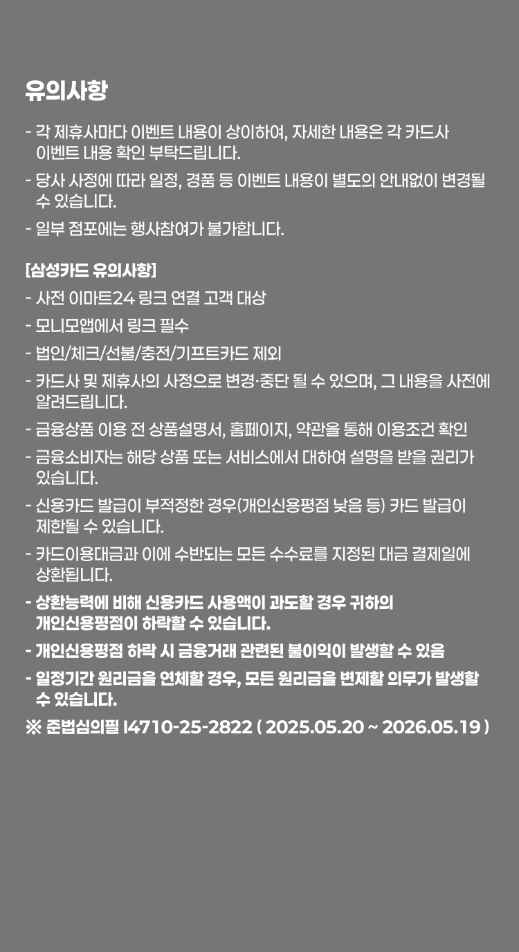 - 카드사 및 제휴사의 사정으로 변경·중단 될 수 있으며, 그 내용을 사전에 알려드립니다.