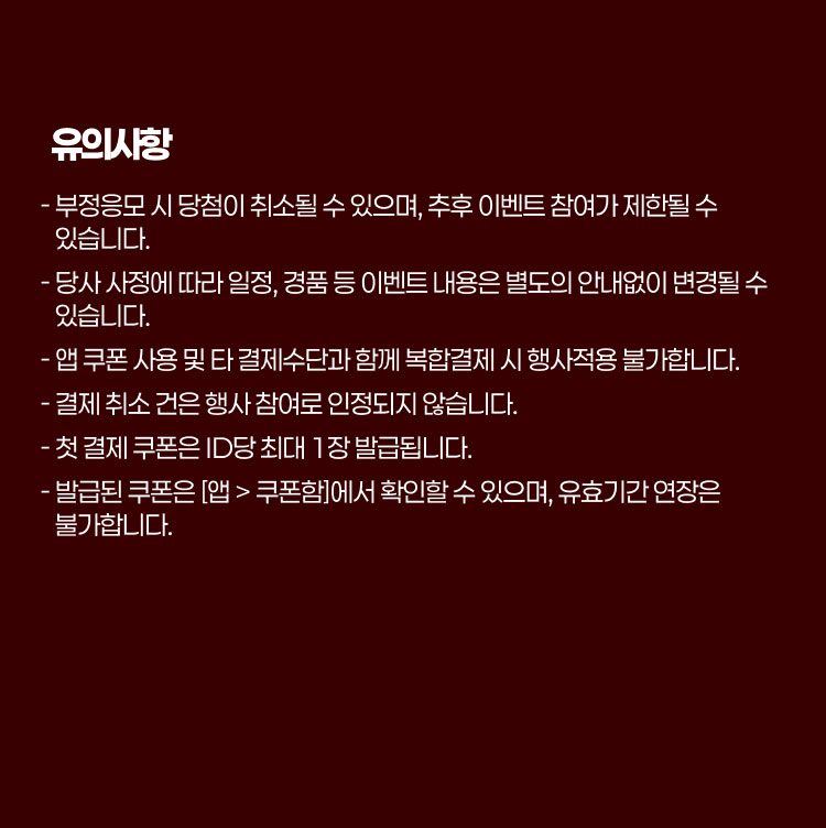 - 앱 쿠폰 사용 및 타 결제수단과 함께 복합결제 시 행사적용 불가합니다.