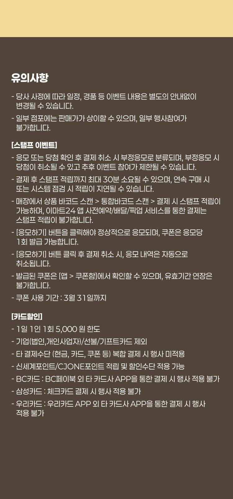 - 타 결제수단 (현금, 카드, 쿠폰 등) 복합 결제 시 행사 미적용