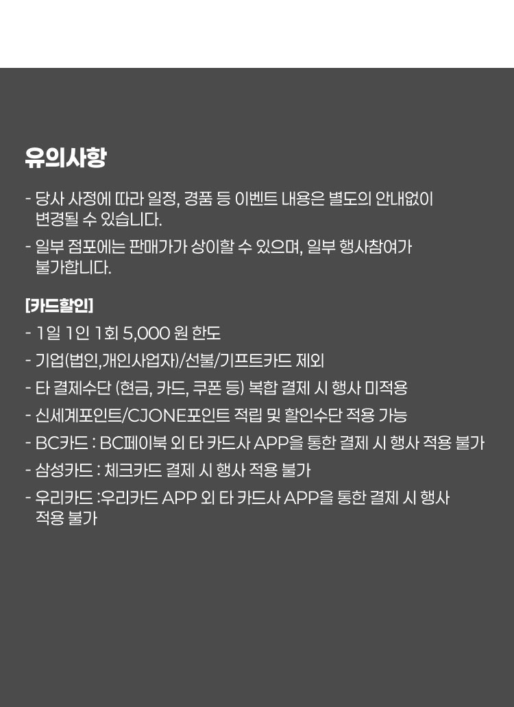 - BC카드 : BC페이북 외 타 카드사 APP을 통한 결제 시 행사 적용 불가