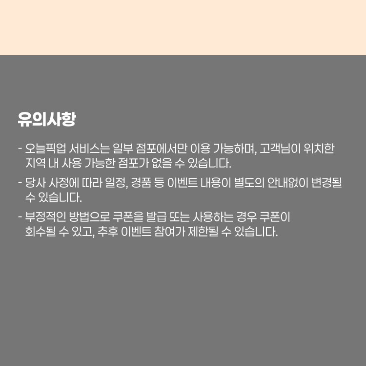 - 오늘픽업 서비스는 일부 점포에서만 이용 가능하며, 고객님이 위치한 지역 내 사용 가능한 점포가 없을 수 있습니다.
