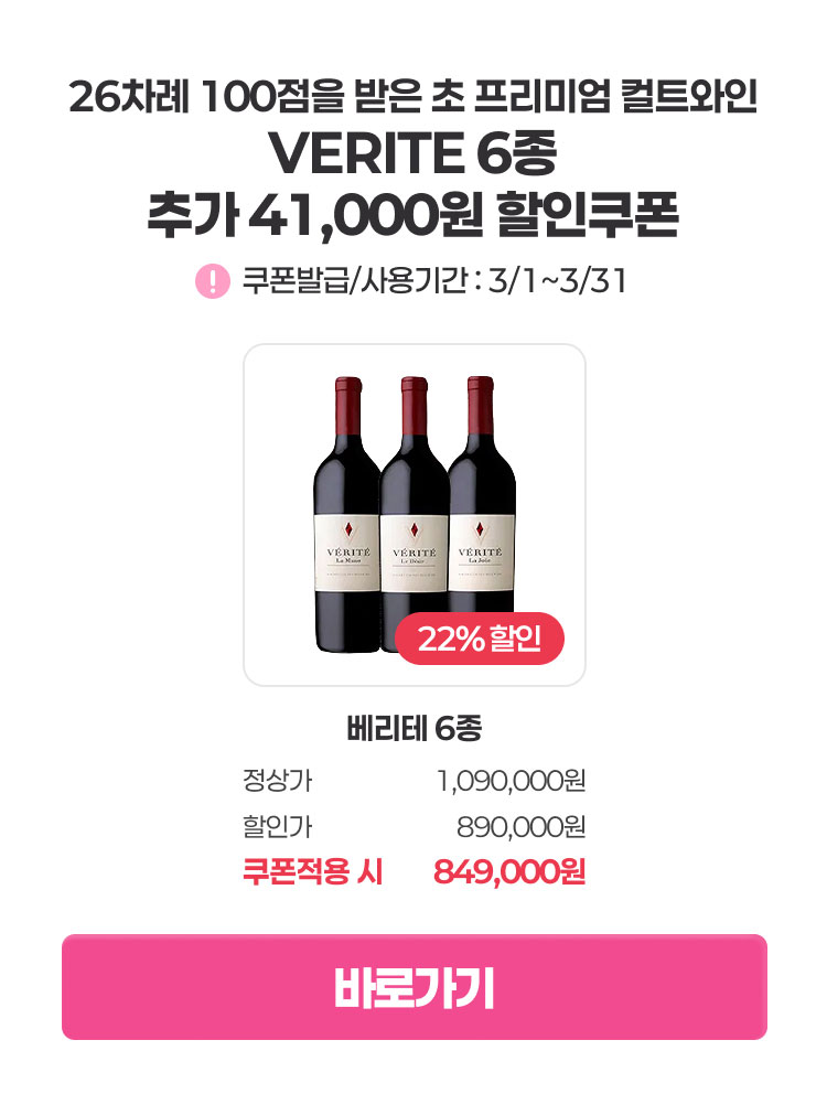 26차례 100점을 받은 초 프리미엄 컬트와인 VERITE 6종 추가 41,000원 할인쿠폰