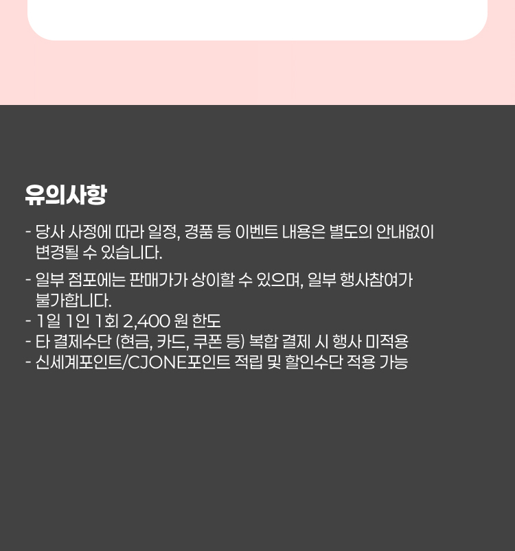 - 타 결제수단 (현금, 카드, 쿠폰 등) 복합 결제 시 행사 미적용