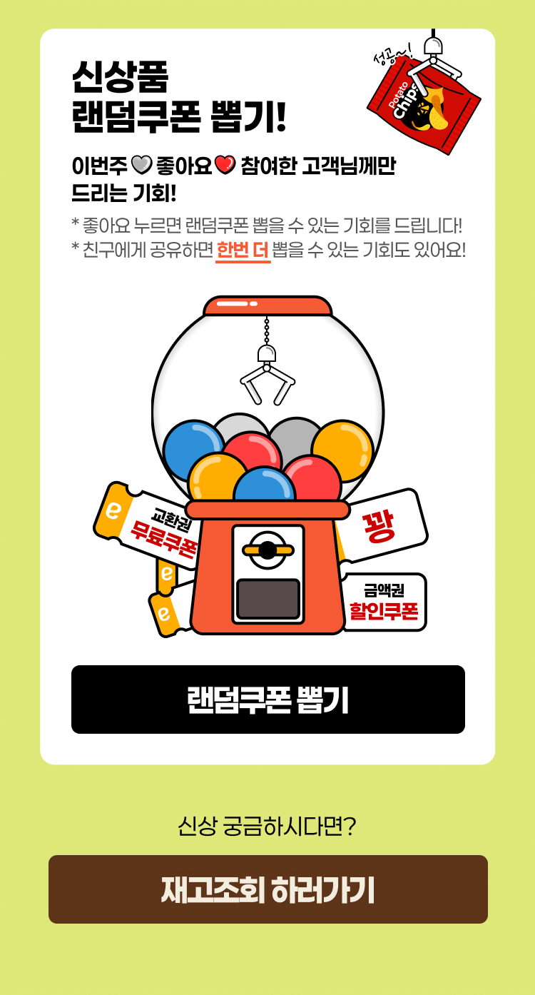 - 랜덤쿠폰 이벤트는 꽝, 특정 신상품 무료 쿠폰, 할인쿠폰 중 1개의 결과 내역이 노출됩니다.