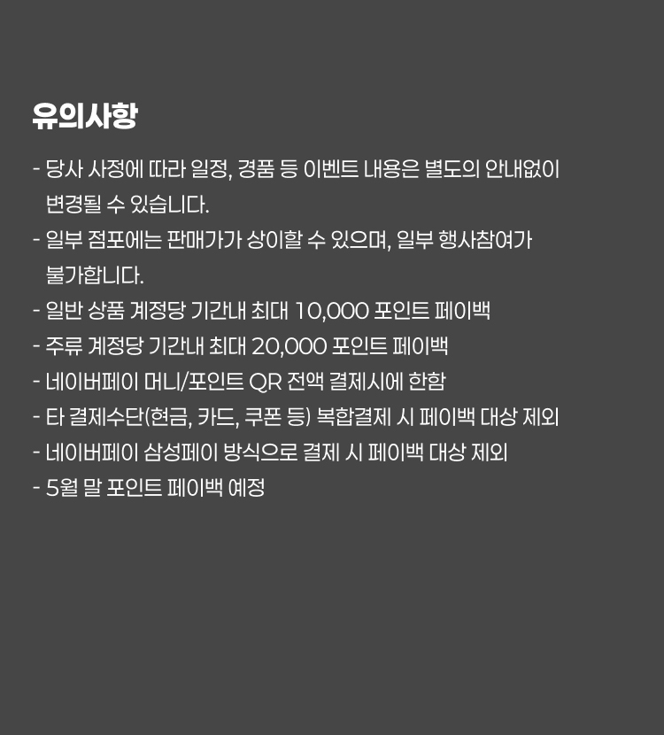 - 주류 계정당 기간내 최대 20,000 포인트 페이백