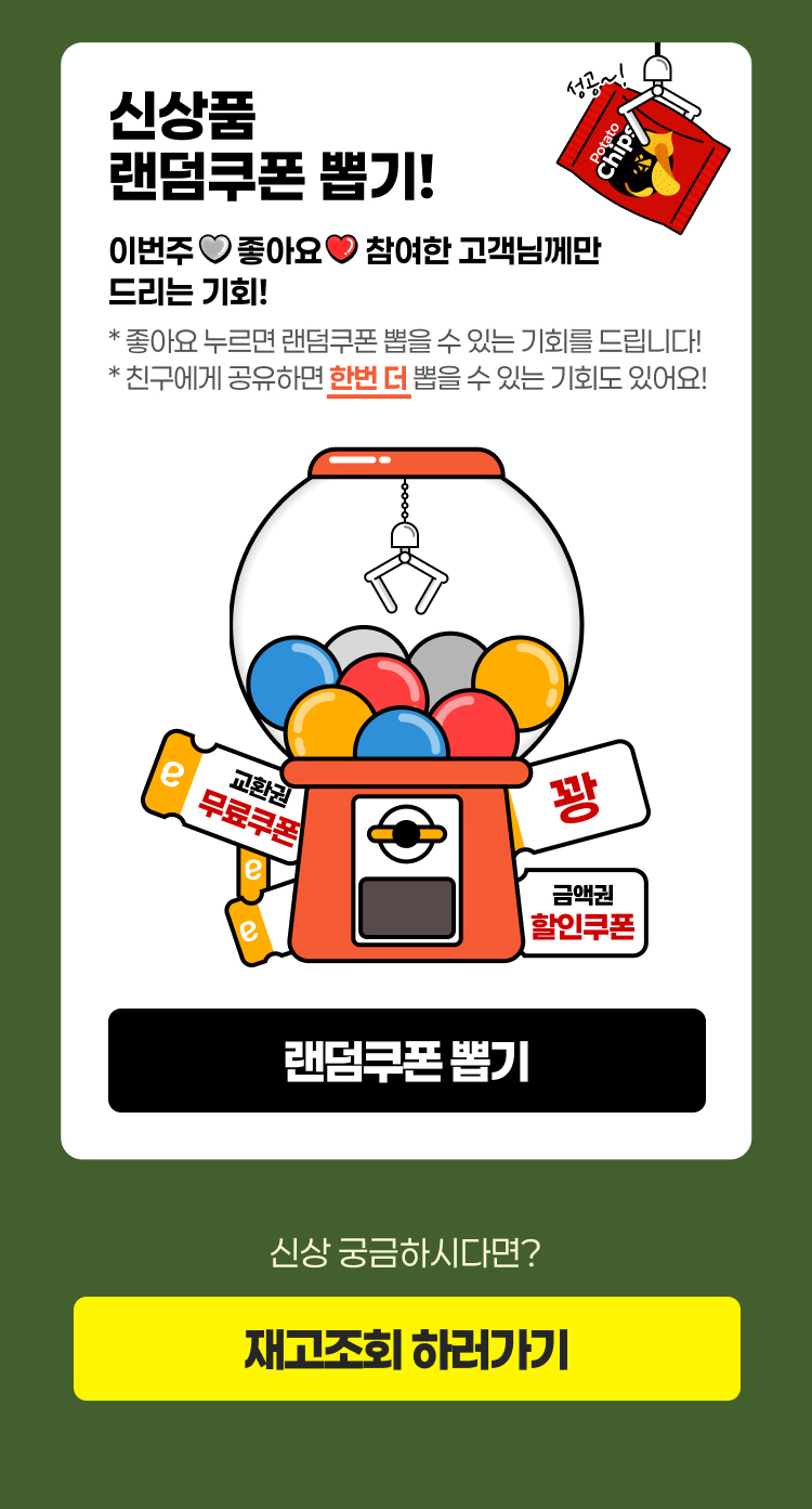 - 랜덤쿠폰 이벤트는 꽝, 특정 신상품 무료 쿠폰, 할인쿠폰 중 1개의 결과 내역이 노출됩니다.